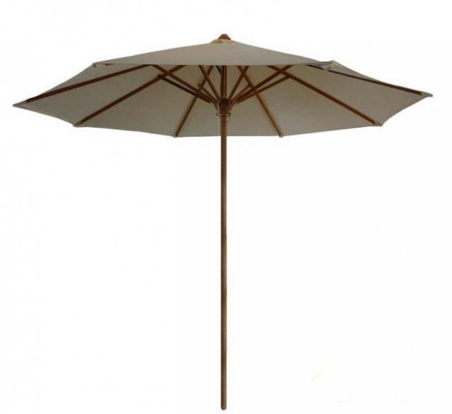 Teakový slunečník vysoký 250 cm, průměr 250 cm. Látka - přírodní, impregnovaná, je součástí slunečníku. Jednoduchý otevírací mechanismus s kladkou a zajišťovacím kolíčkem.